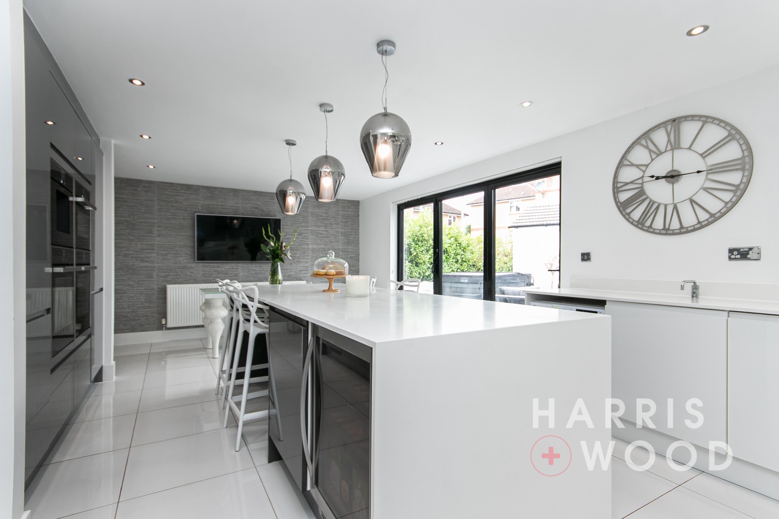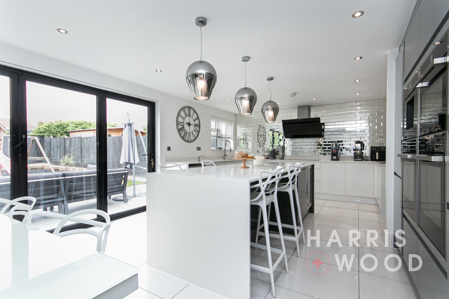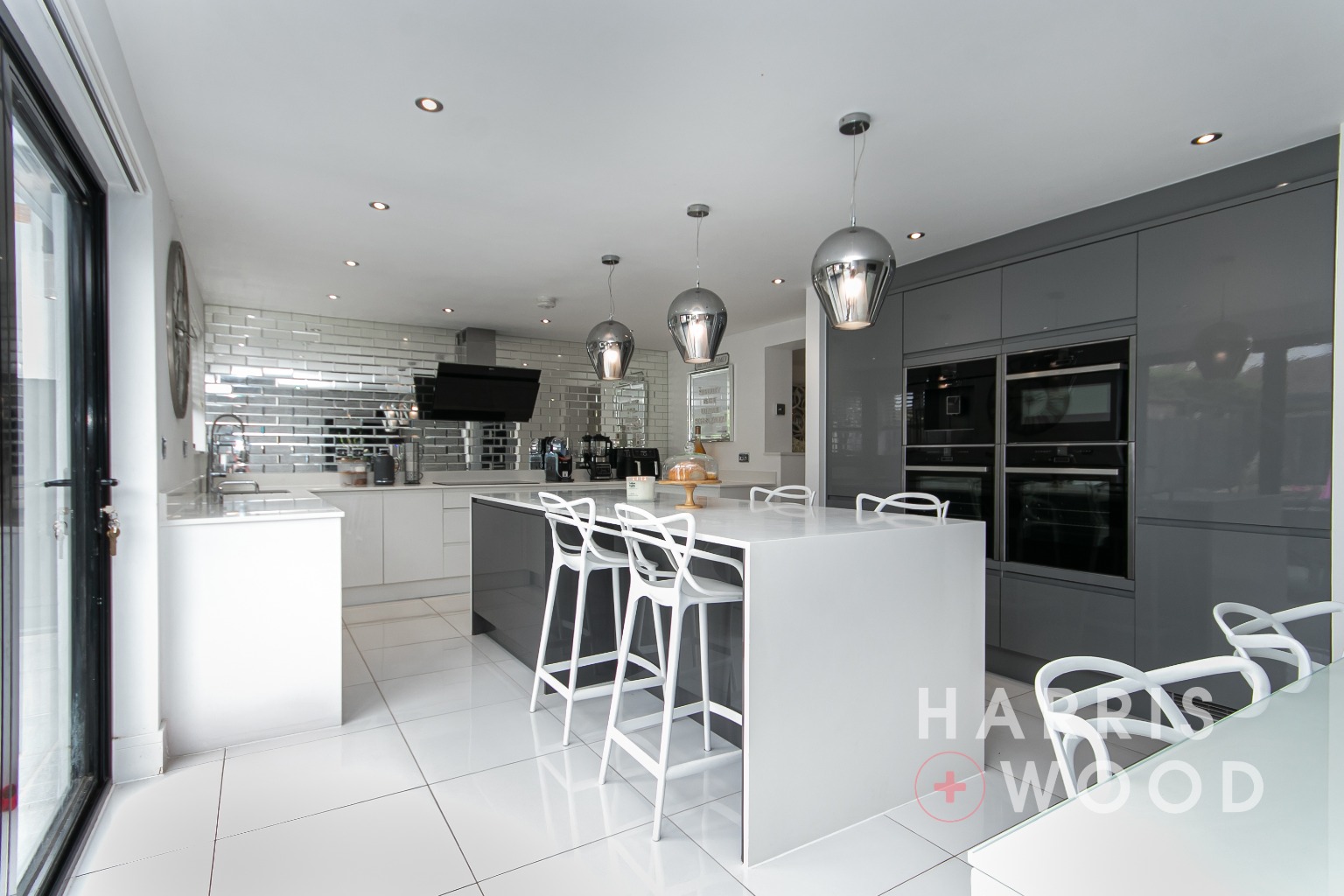 Double French doors to rear leading out onto the rear garden, double glazed window to rear, wall and base level units, sink and drainer with mixer tap over, oven and hob, extractor fan, worktops, integrated appliances, island area, radiator