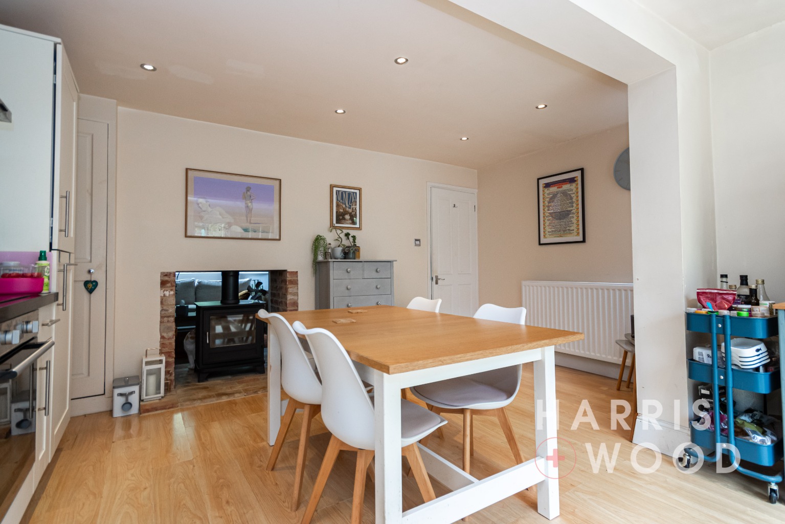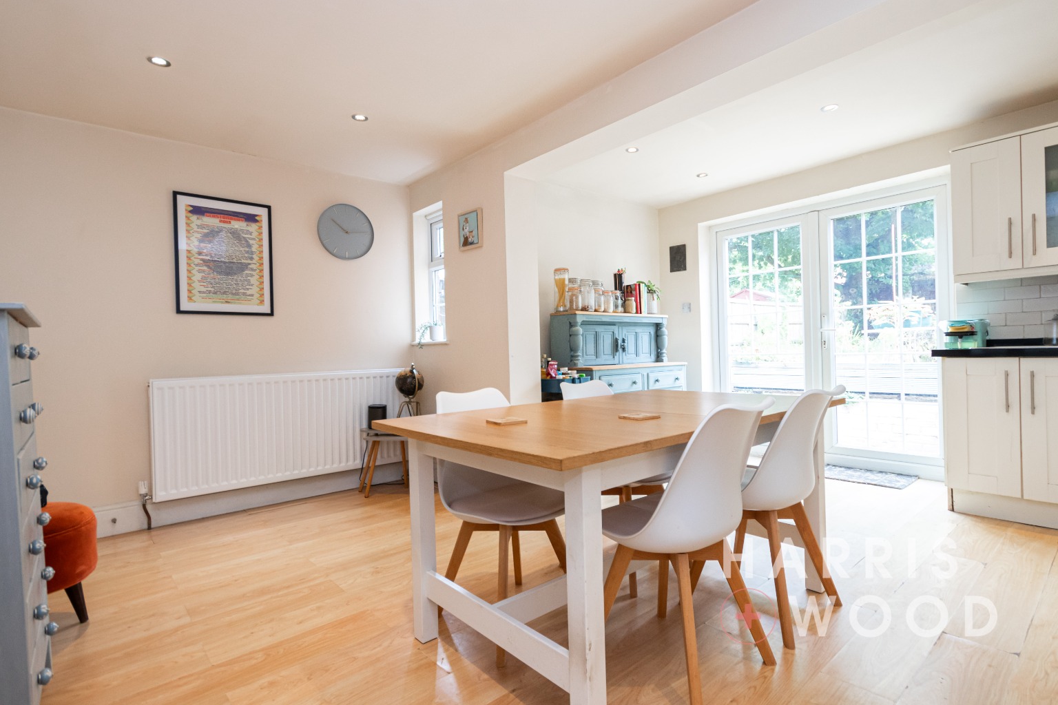Double glazed window and French doors to rear leading out onto the rear garden, storage cupboard, log burner, wall and base level units, sink and drainer with mixer tap over, oven and hob, extractor fan, worktops, space for appliances, radiator, space for dining table and chairs