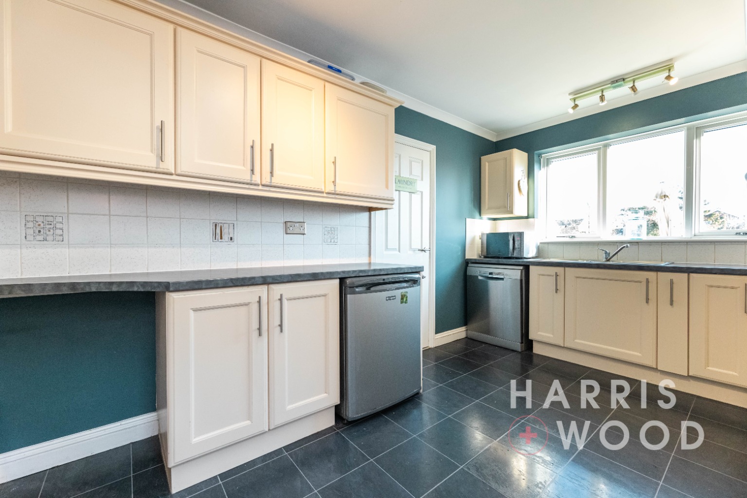 Double glazed window and door, wall and base level units, sink and drainer with mixer tap over, oven and hob, extractor fan, worktops, space for appliances, door to: