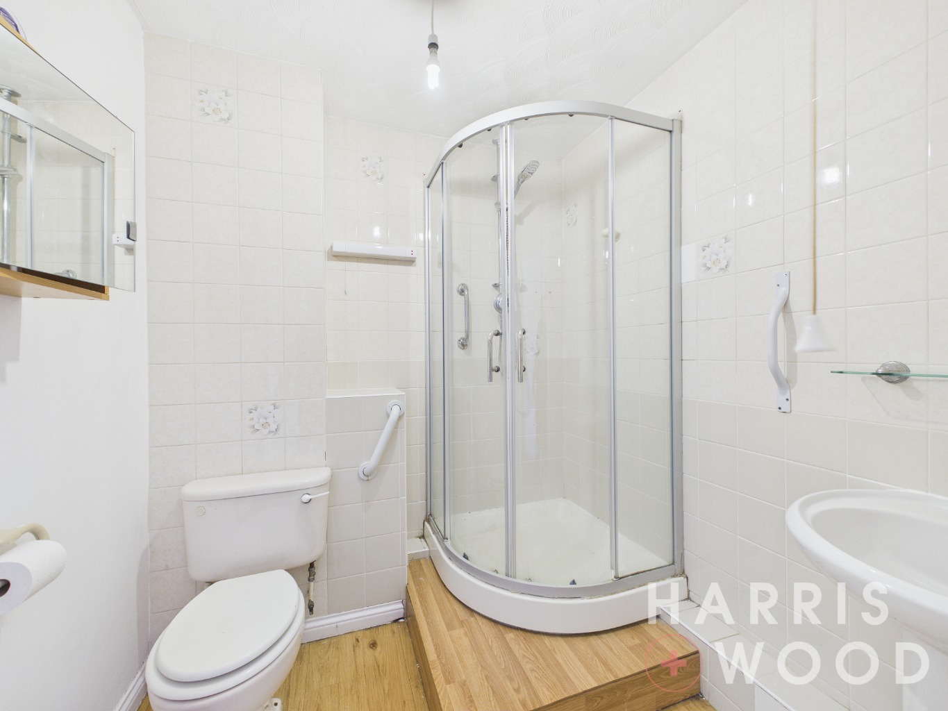 Low level WC, wash hand basin, shower cubicle, heated towel rail, wall mounted electric heater