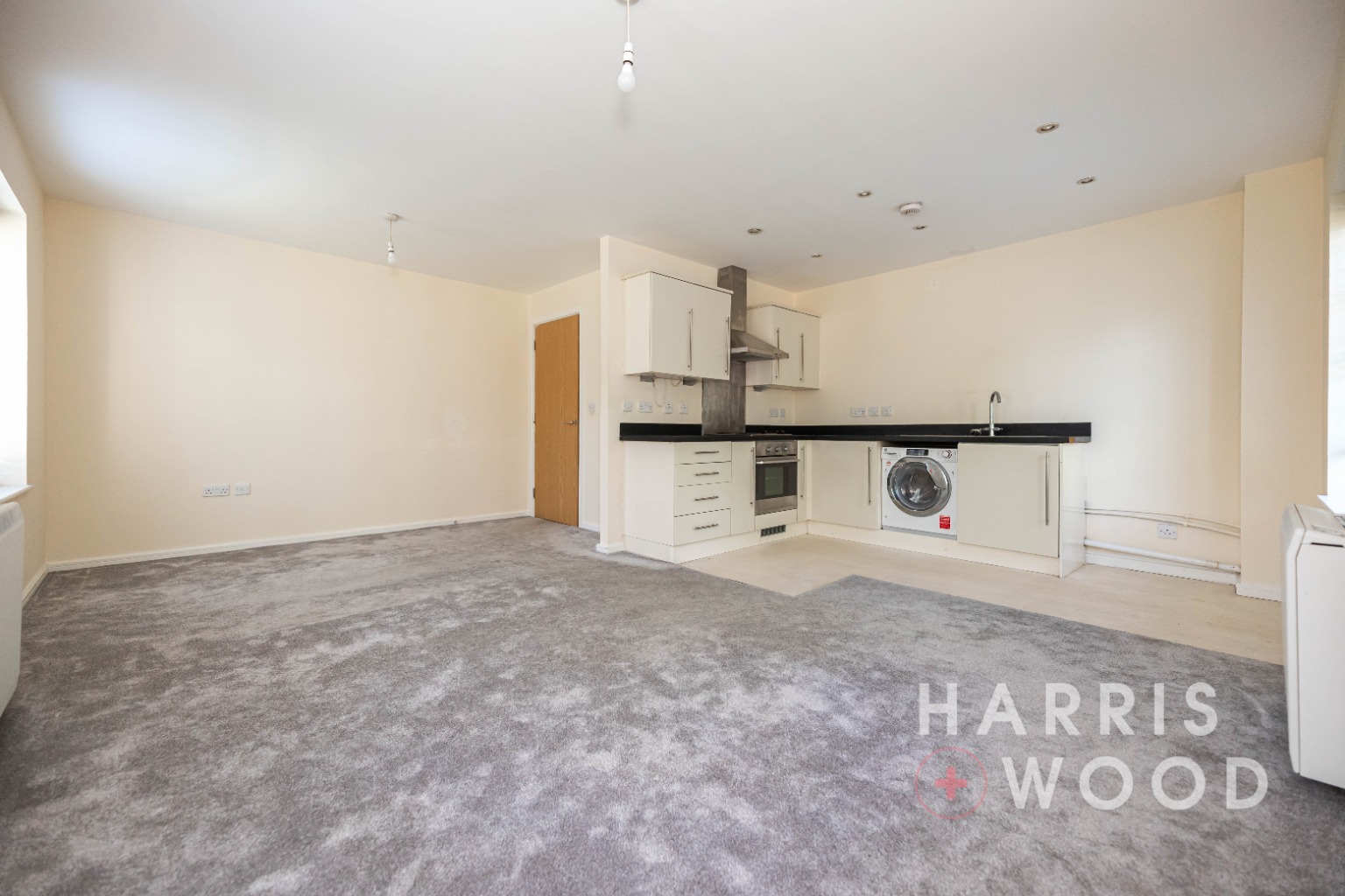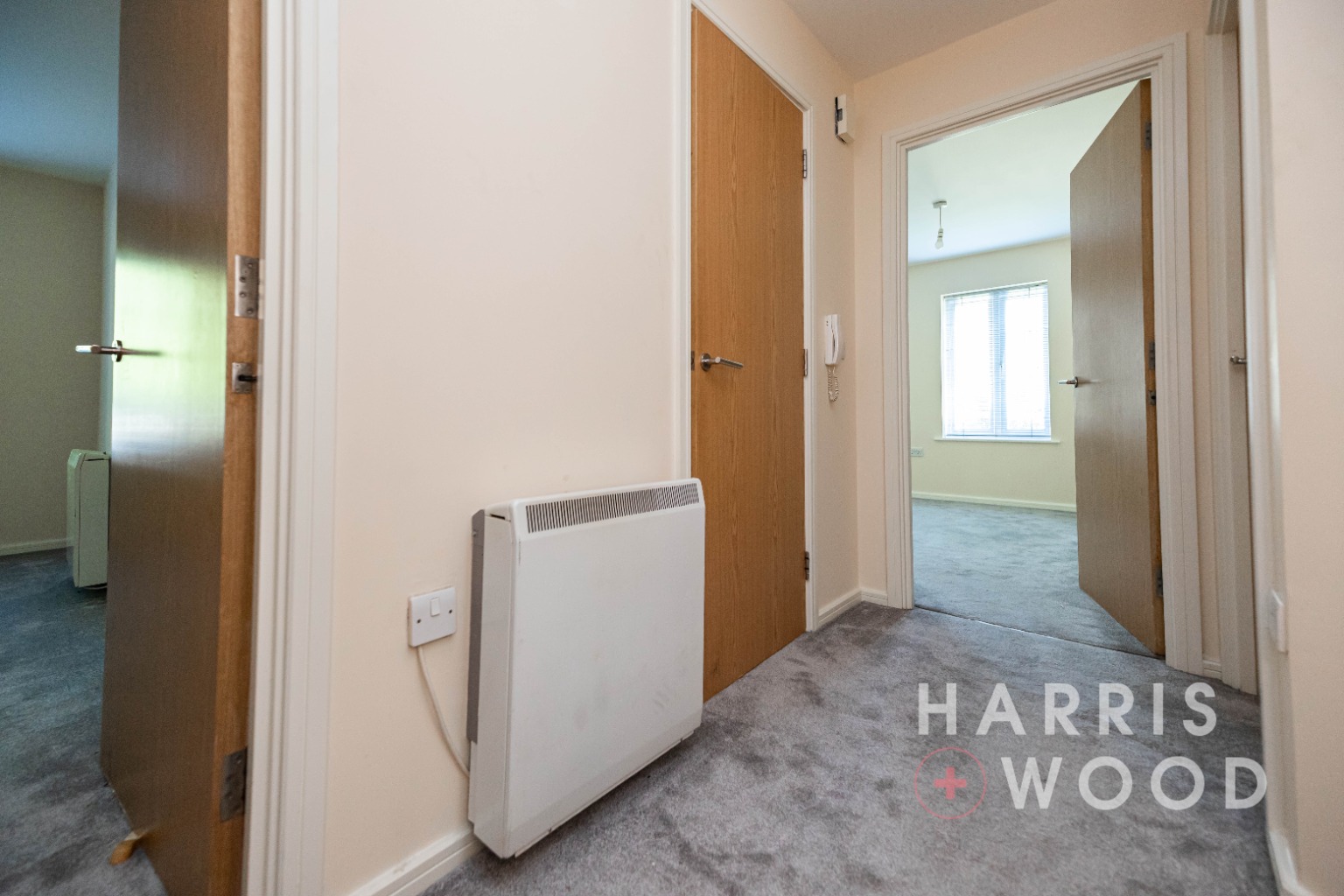 Entrance door, storage cupboards, doors leading off