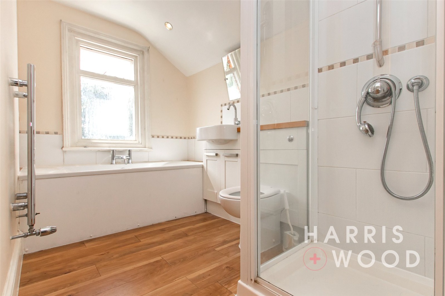 Double glazed frosted window to rear, low level WC, wash hand basin, bath with shower over, shower cubicle