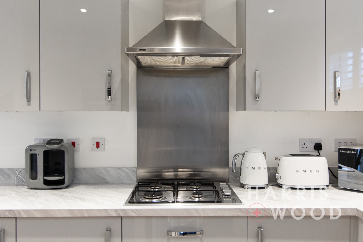 Double glazed windows and French doors, modern wall and base level units, sink and drainer with mixer tap over, oven and hob, extractor fan, worktops, integrated appliances, radiator