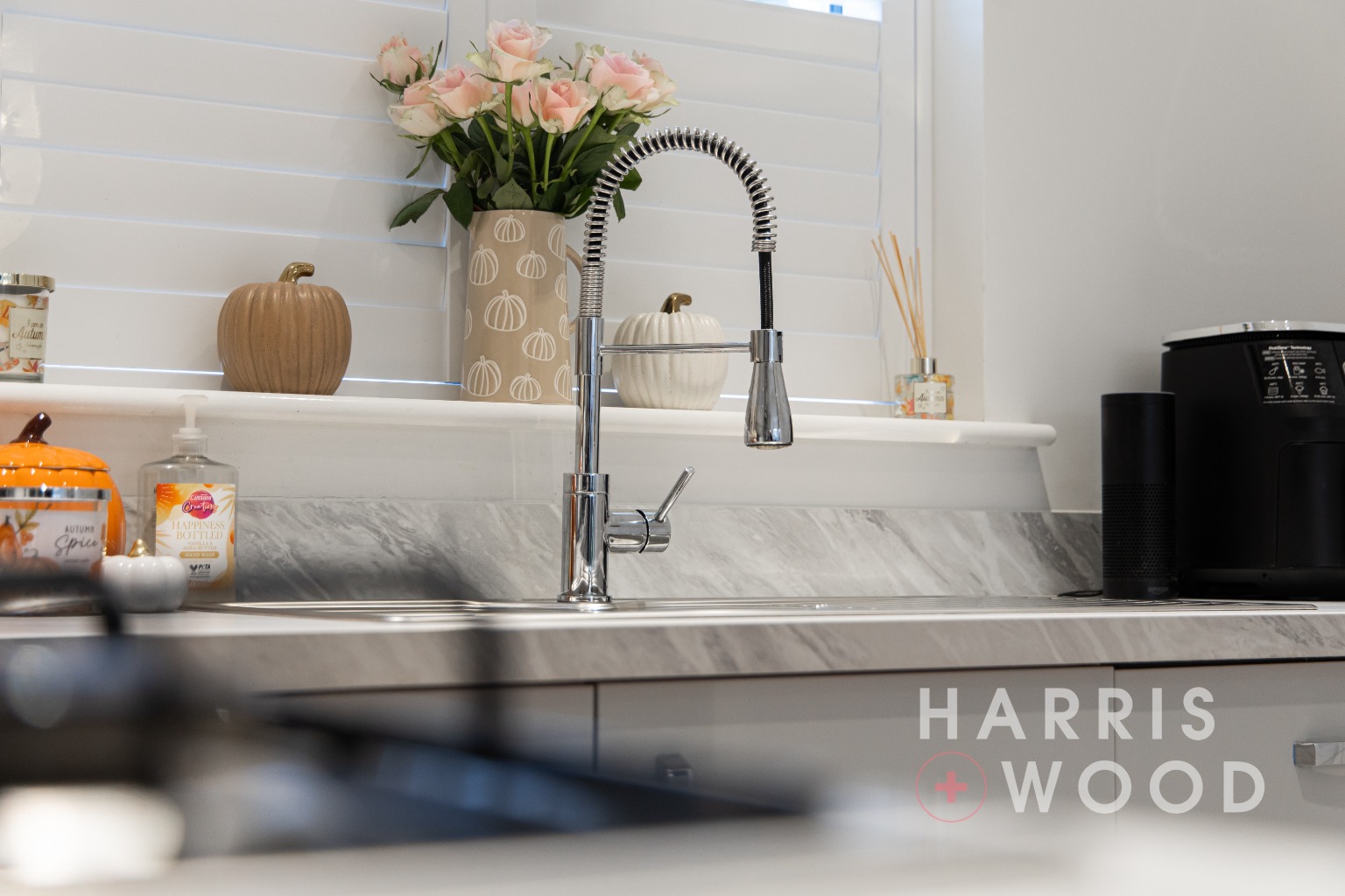 Double glazed window, wall mounted boiler, worktops, sink, storage cupboard