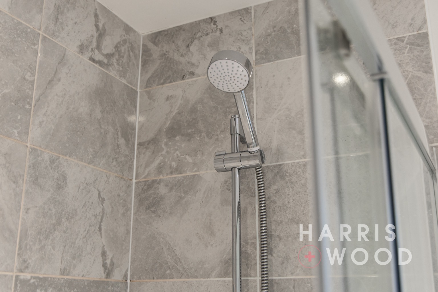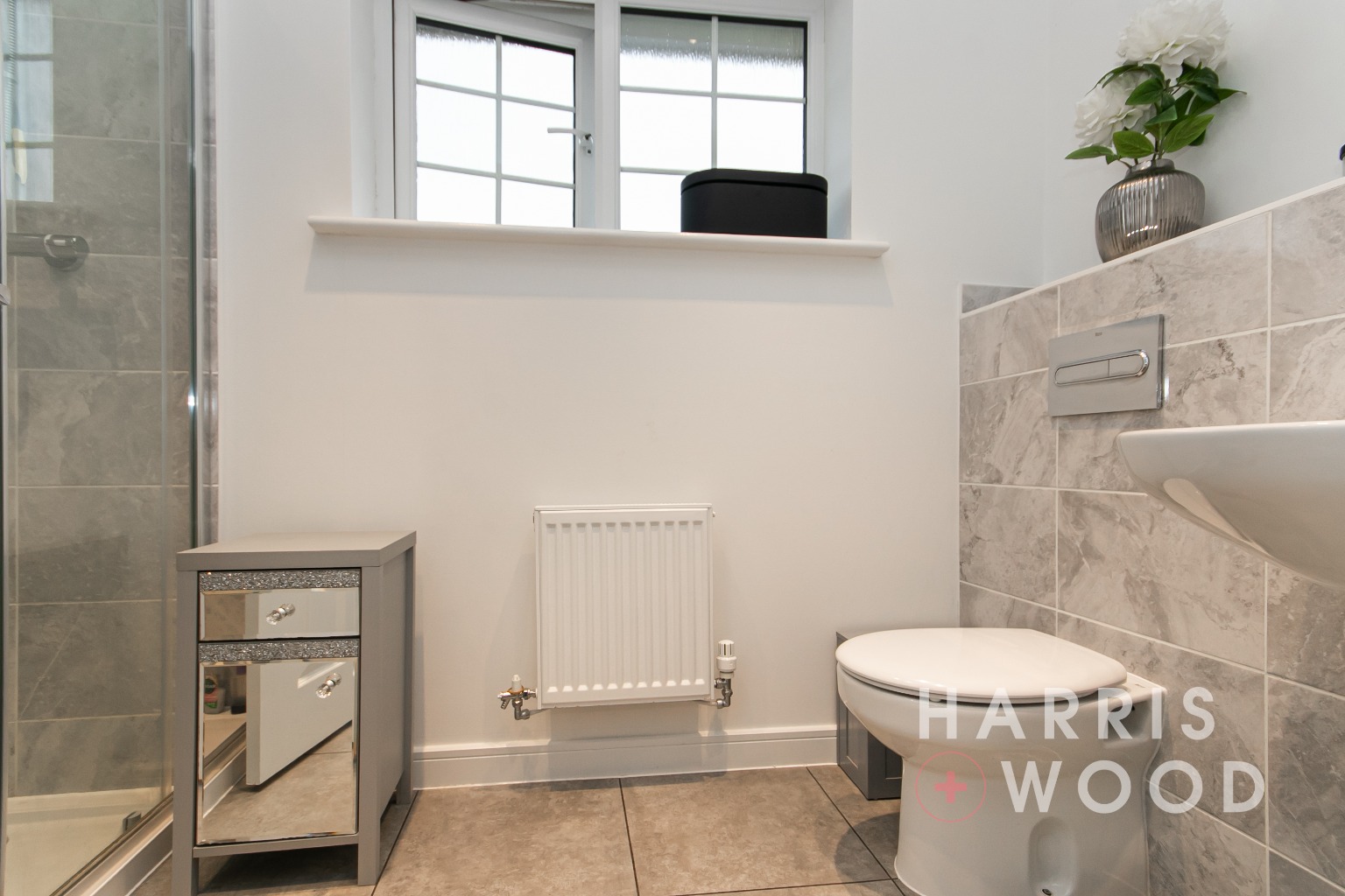 Obscure double glazed window, low level WC, wash hand basin, shower cubicle, partly tiled walls, tiled flooring, radiator
